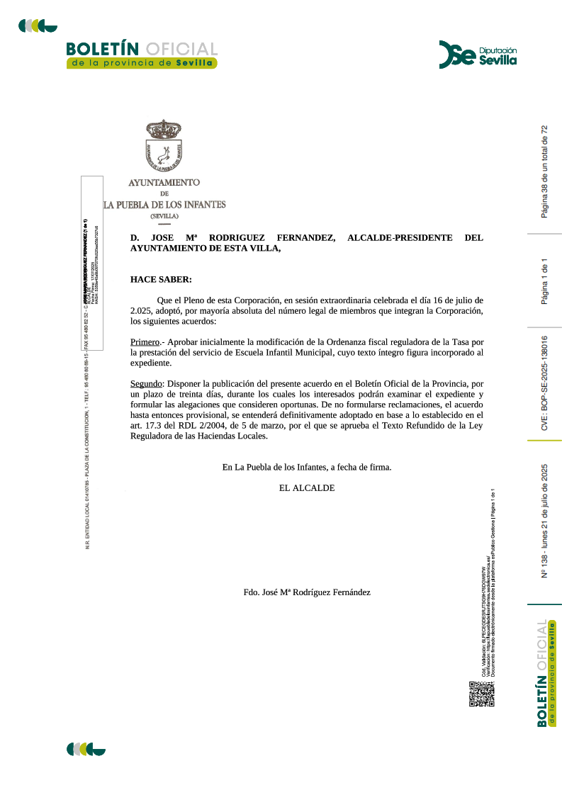 Anuncio de la modificación de la tasa por prestación del servicio de Escuela Infantil