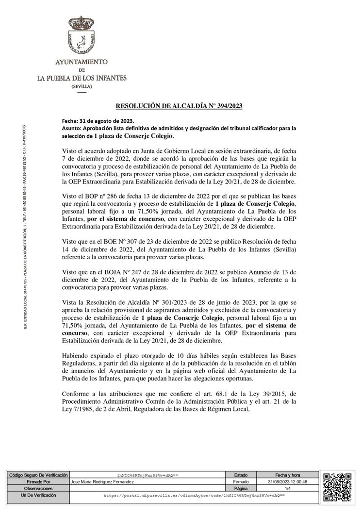 Resolución 394-2023 Lista definitiva Admitidos Conserje F