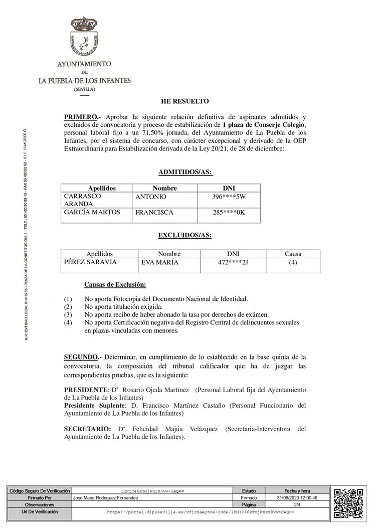Lista definitiva de admitidos y designación del tribunal calificador para la selección de 1 plaza de Conserje Colegio