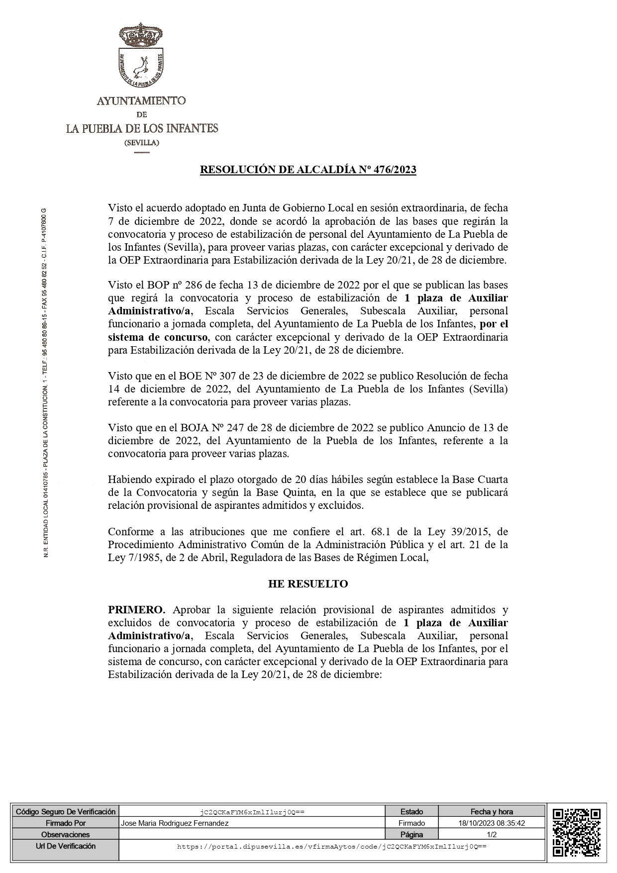 Resolución 476-2023 provisional Admitidos Aux Adm Func F