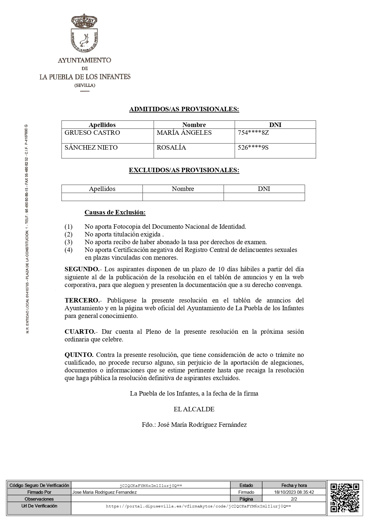 Relación provisional de aspirantes admitidos y excluidos de convocatoria y proceso de estabilización de 1 plaza de Auxiliar Administrativo/a