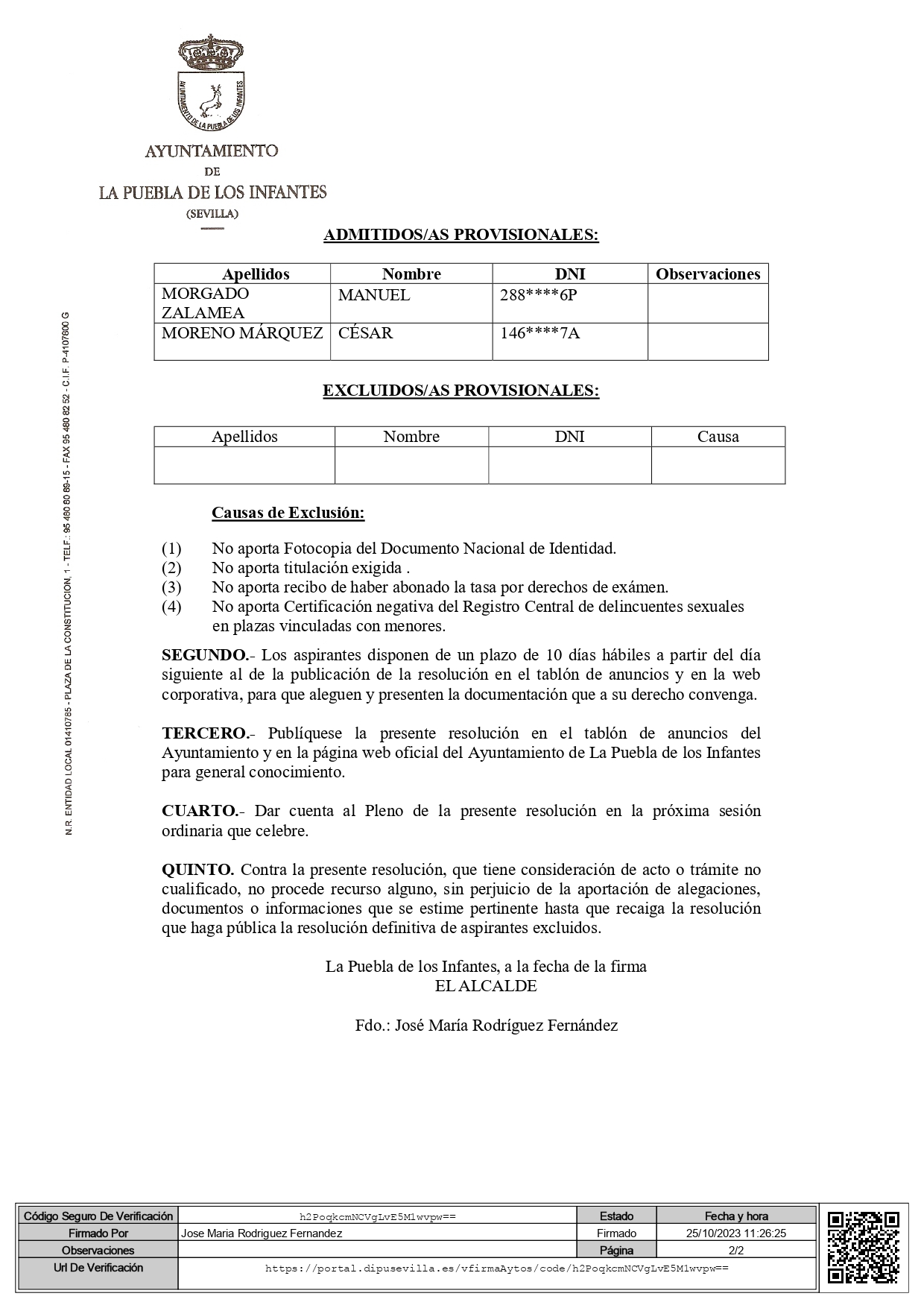 Relación provisional de aspirantes admitidos y excluidos de convocatoria y proceso de estabilización de 1 plaza de Encargado/a Obras