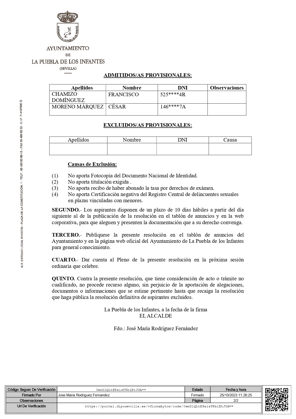 Relación provisional de aspirantes admitidos y excluidos de convocatoria y proceso de estabilización de 1 plaza de Fontanero