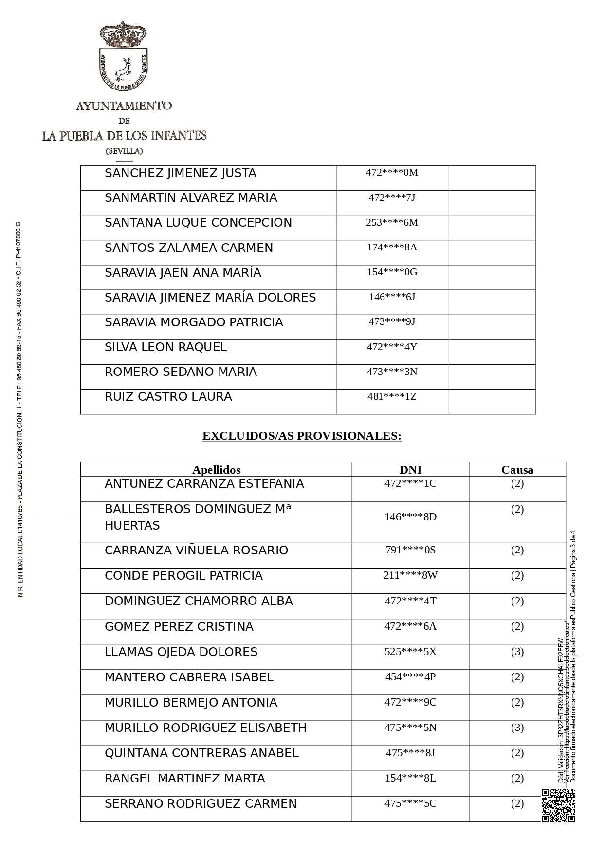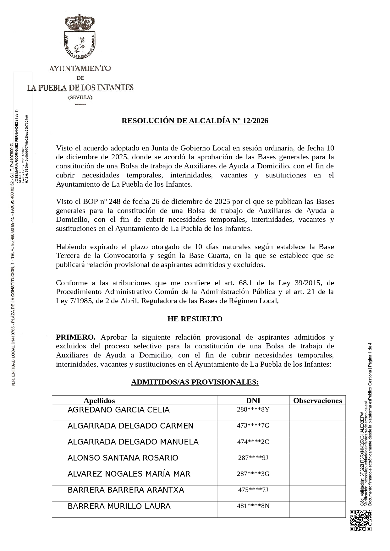 Relación provisional de aspirantes admitidos y excluidos del proceso selectivo para la constitución de una Bolsa de trabajo de Auxiliares de Ayuda a Domicilio