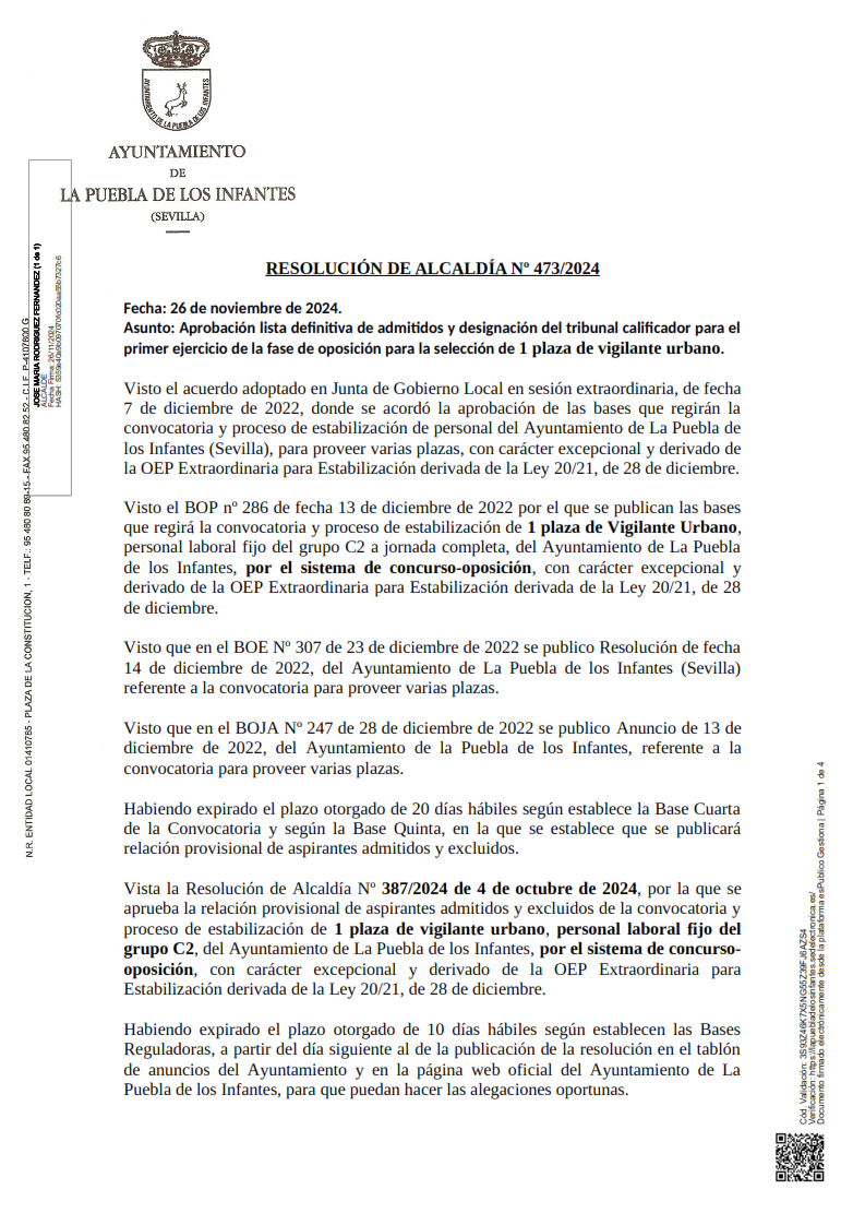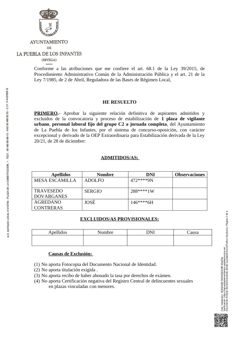 Relación definitiva de aspirantes admitidos y excluidos de convocatoria y proceso de estabilización de 1 plaza de Vigilante Urbano