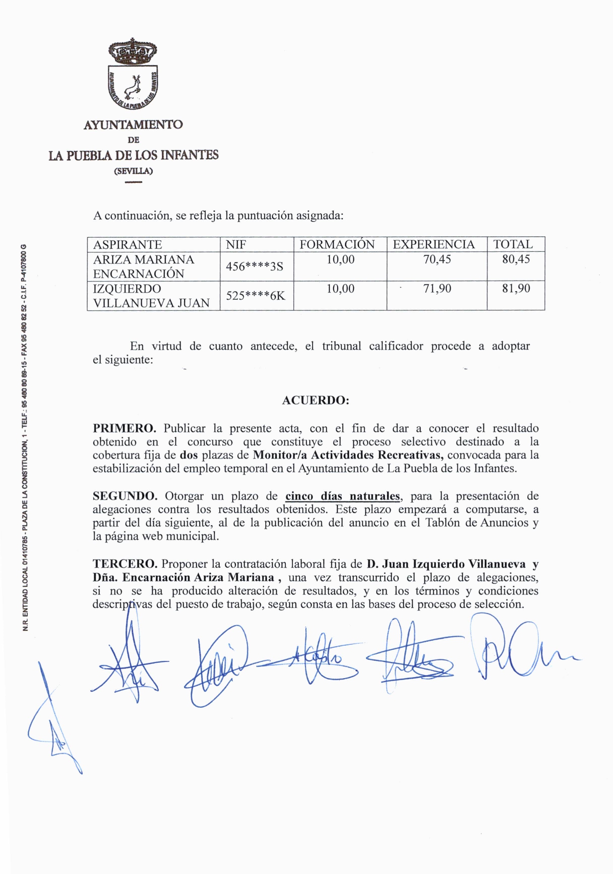 Acta del Tribunal Calificador del proceso de selección de dos plazas de Monitor/a de Actividades Recreativas