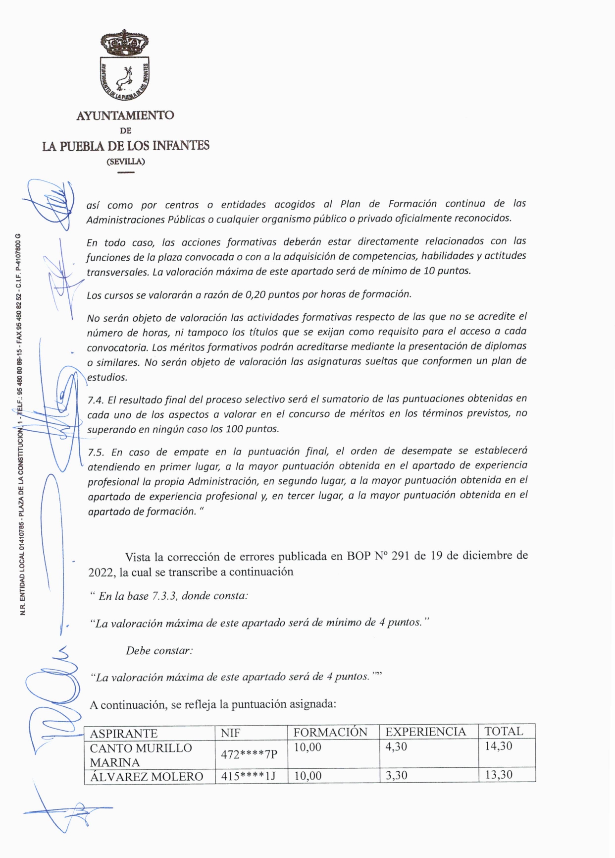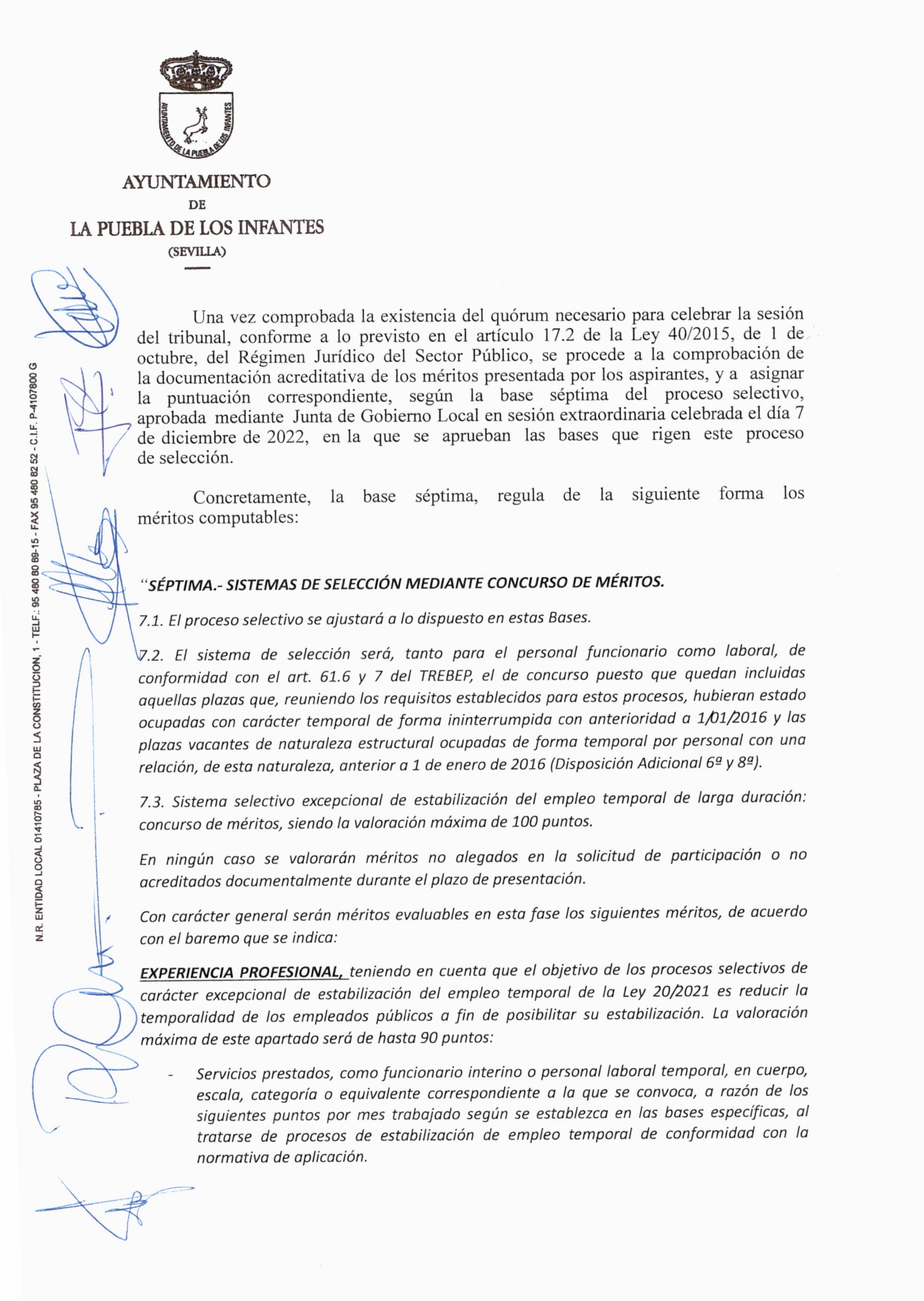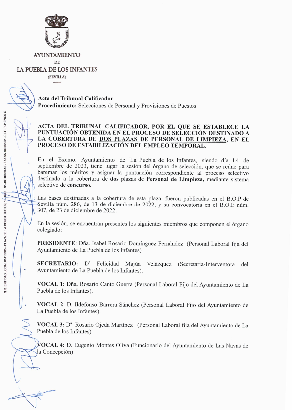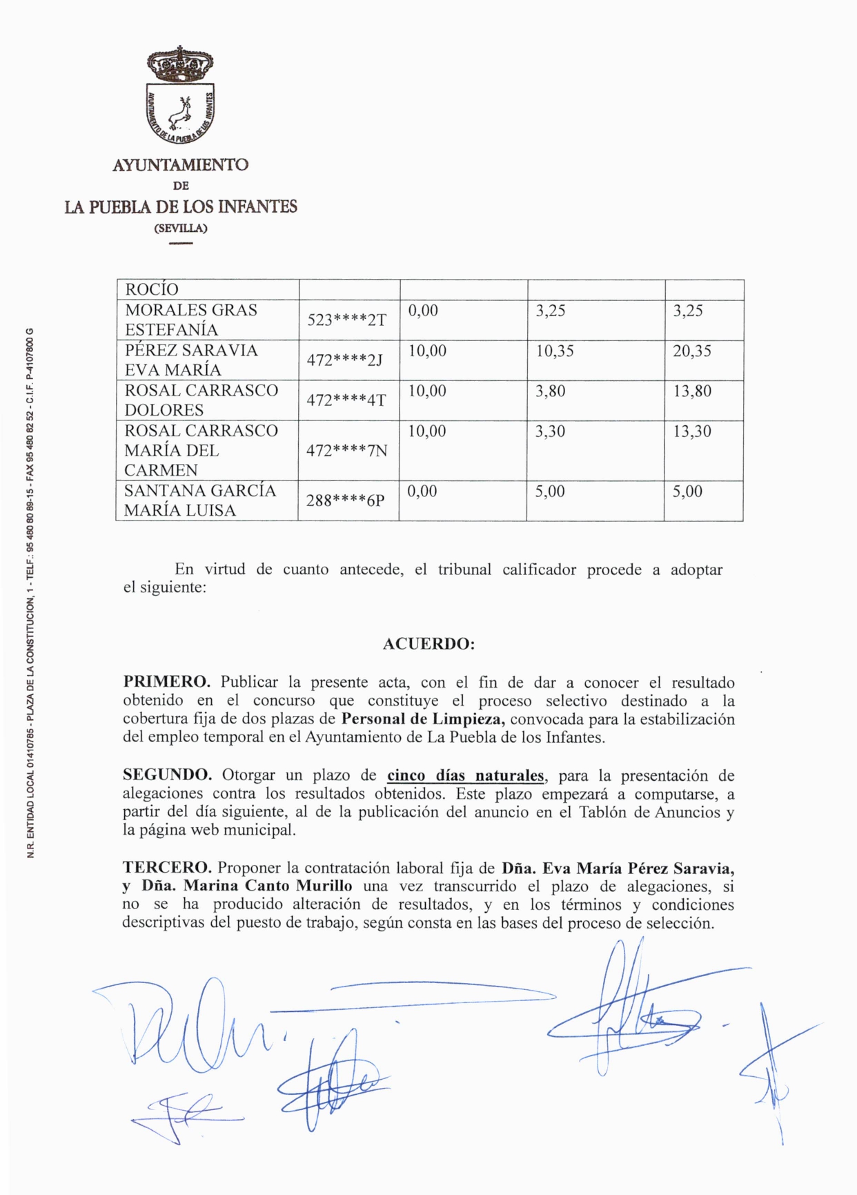 Acta del tribunal calificador del proceso de selección de dos plazas de personal de limpieza