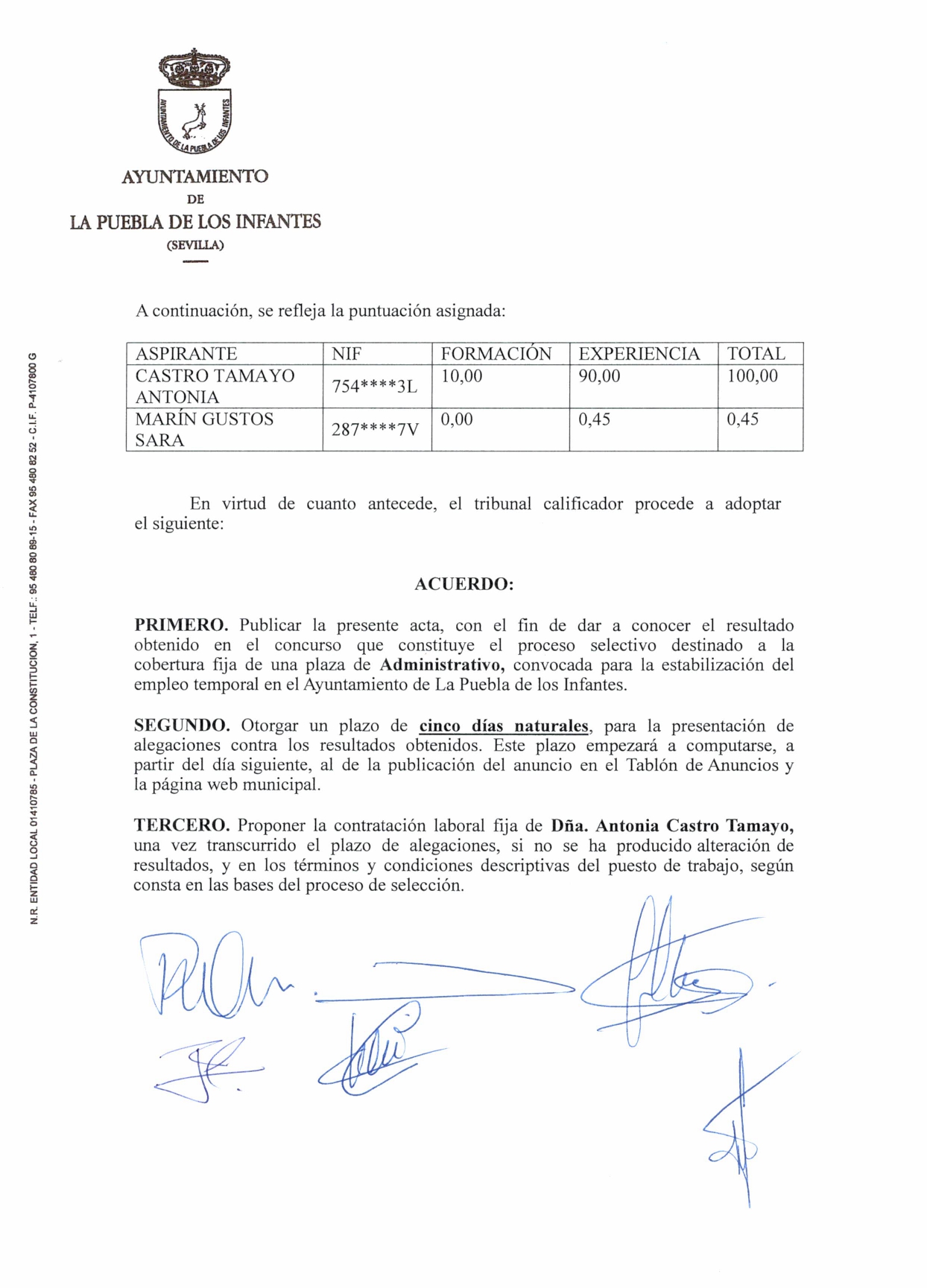 Acta del tribunal calificador del proceso de selección de una plaza de administrativo/a