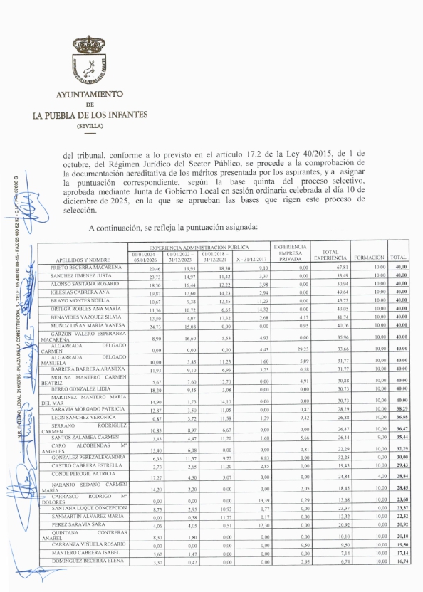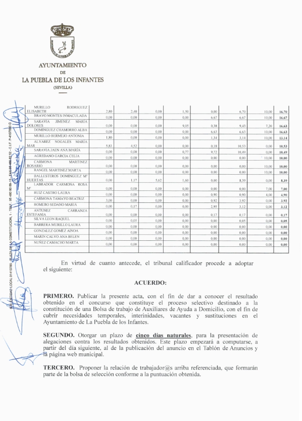 Acta del tribunal calificador del proceso selectivo para la constitución de una Bolsa de trabajo de Auxiliares de Ayuda a Domicilio