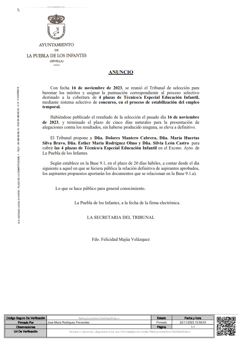 Anuncio definitivo del proceso de selección de cuatro plazas de Técnico/a Especial Educación Infantil