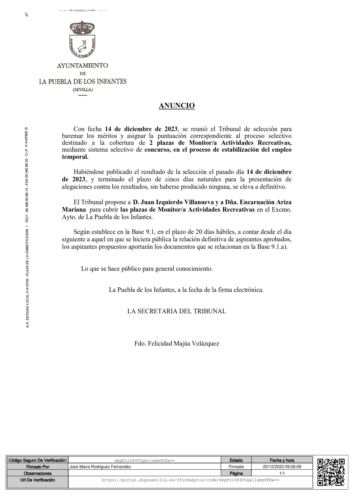 Anuncio definitivo del proceso de selección de dos plazas de Monitor/a Actividades Recreativas