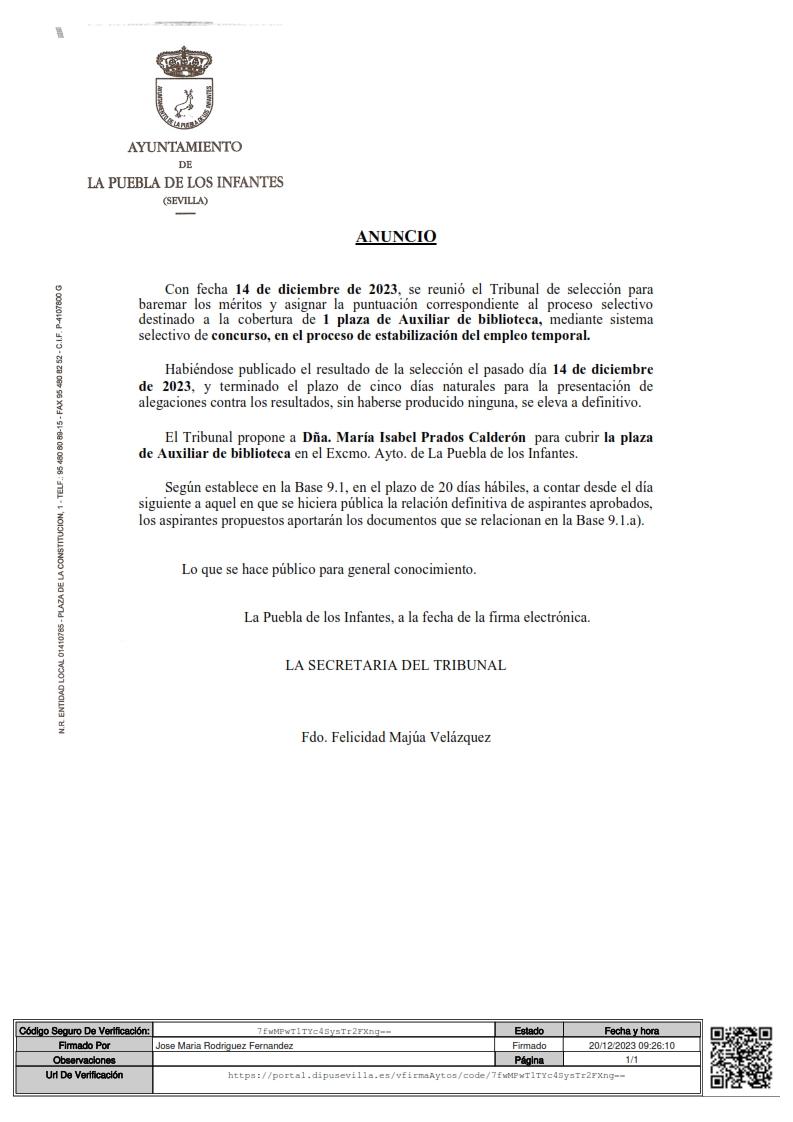 Anuncio definitivo del proceso de selección de una plaza de Auxiliar de Biblioteca
