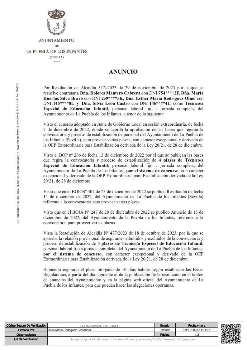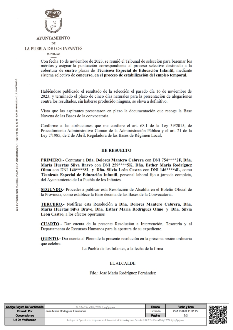 Anuncio del nombramiento de cuatro plazas de Técnico/a Especial de Educación Infantil