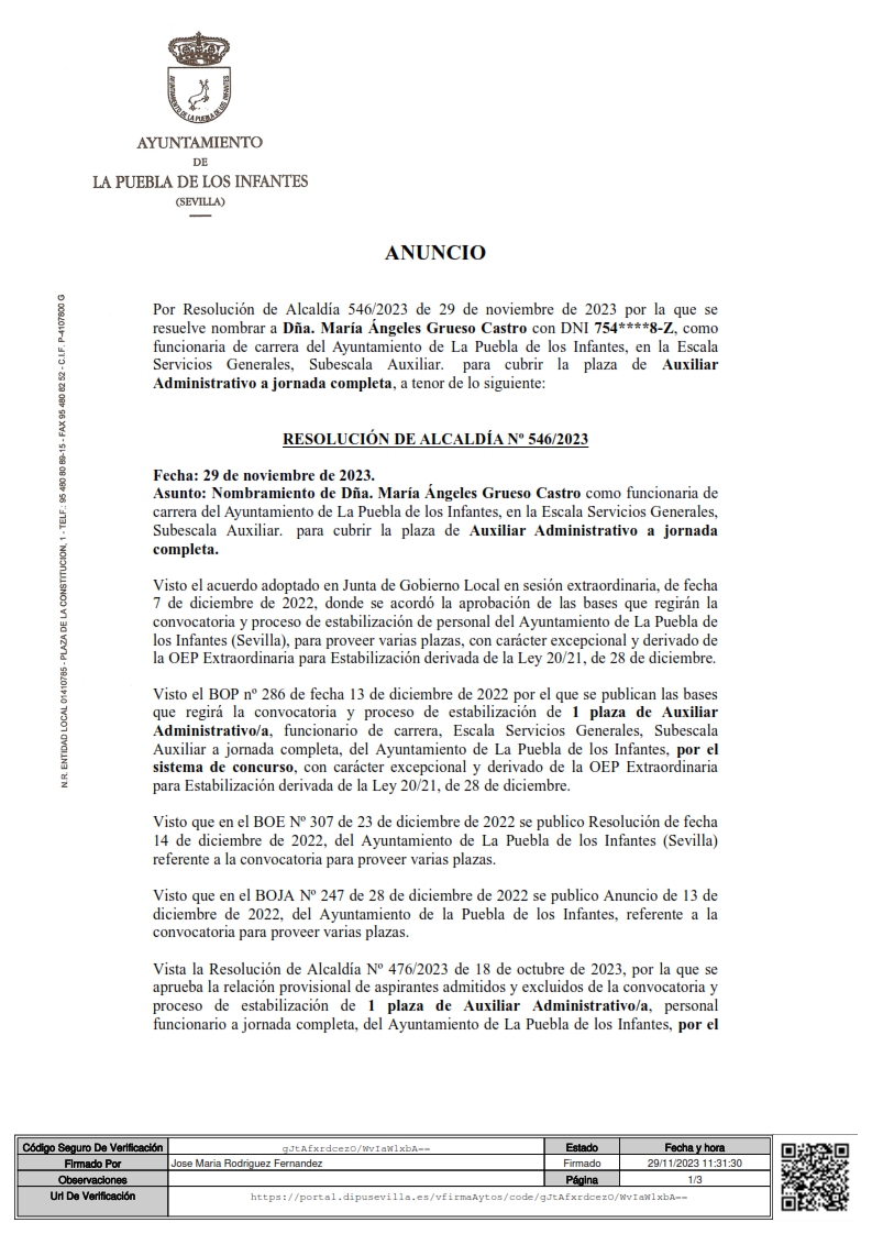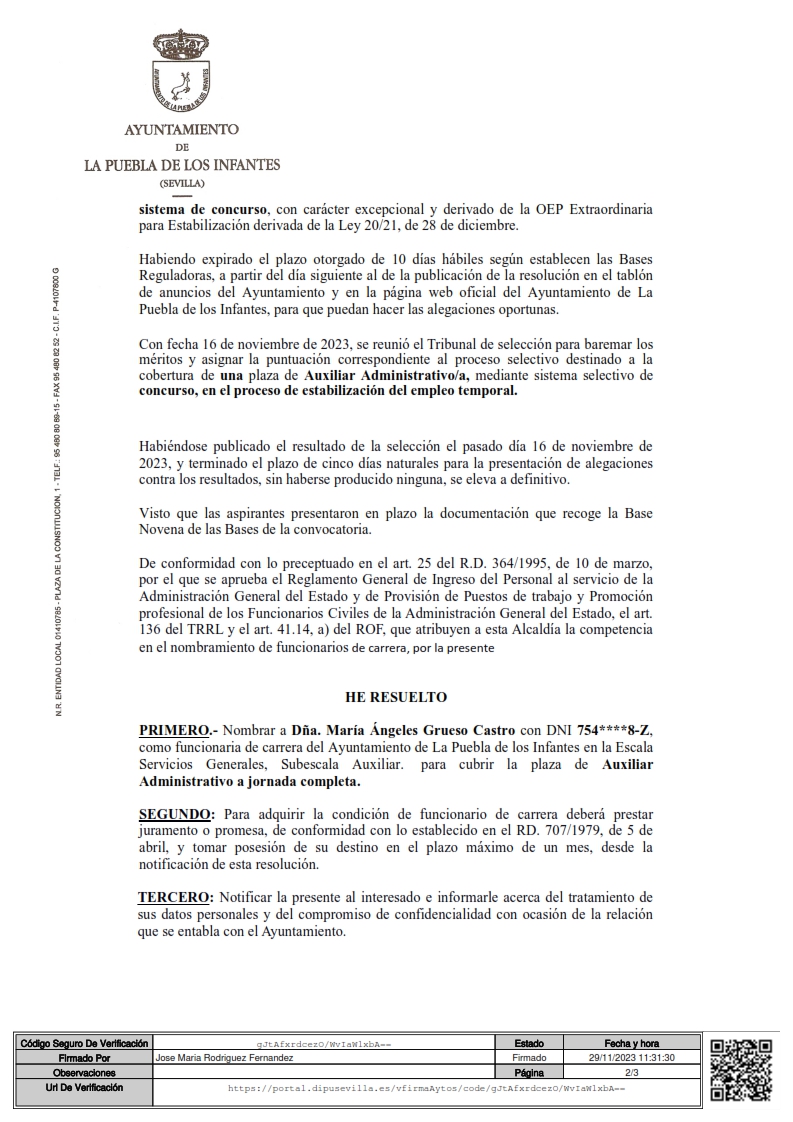 Anuncio del nombramiento de una plaza de Auxiliar Administrativo/a (Funcionario/a)