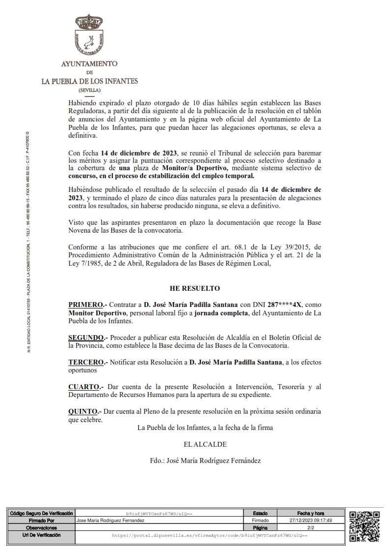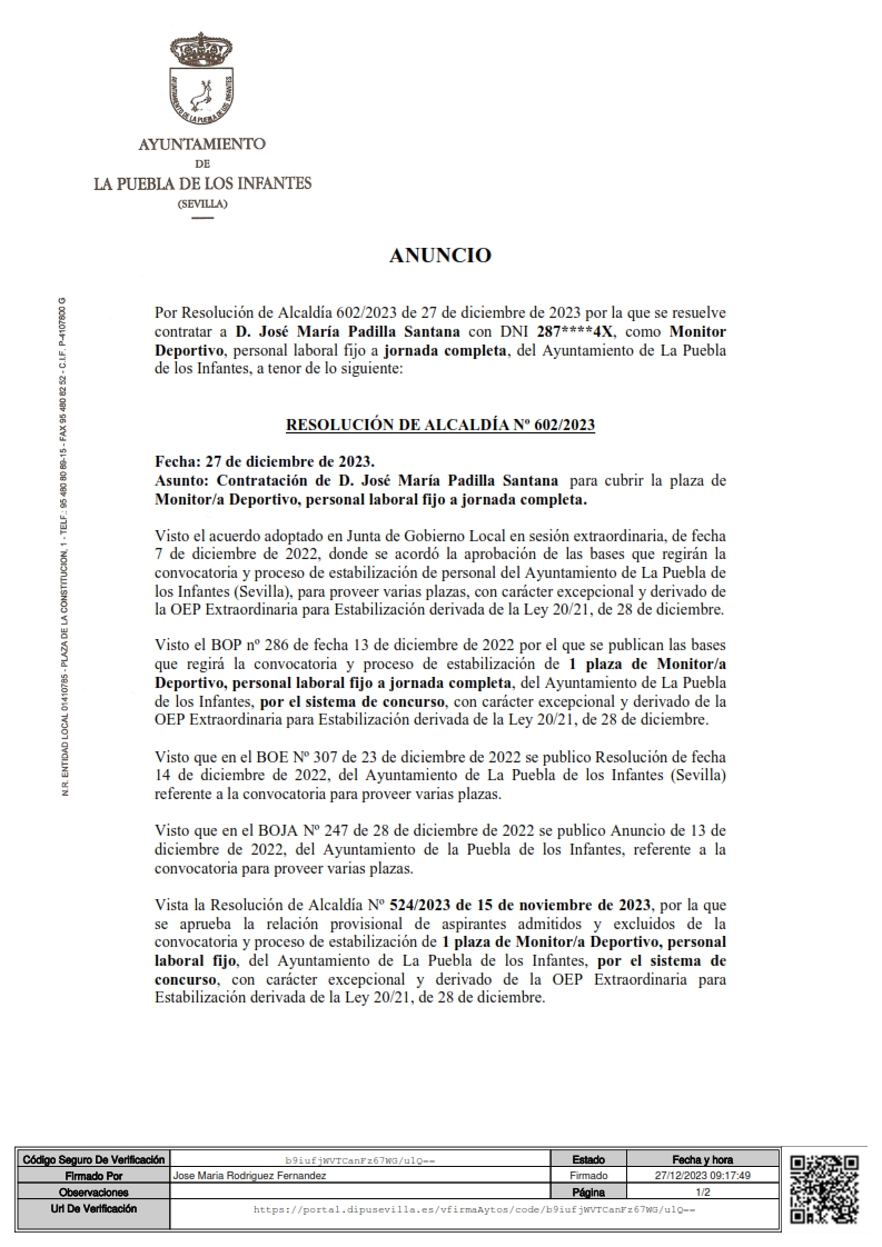 Anuncio del nombramiento de una plaza de Monitor Deportivo