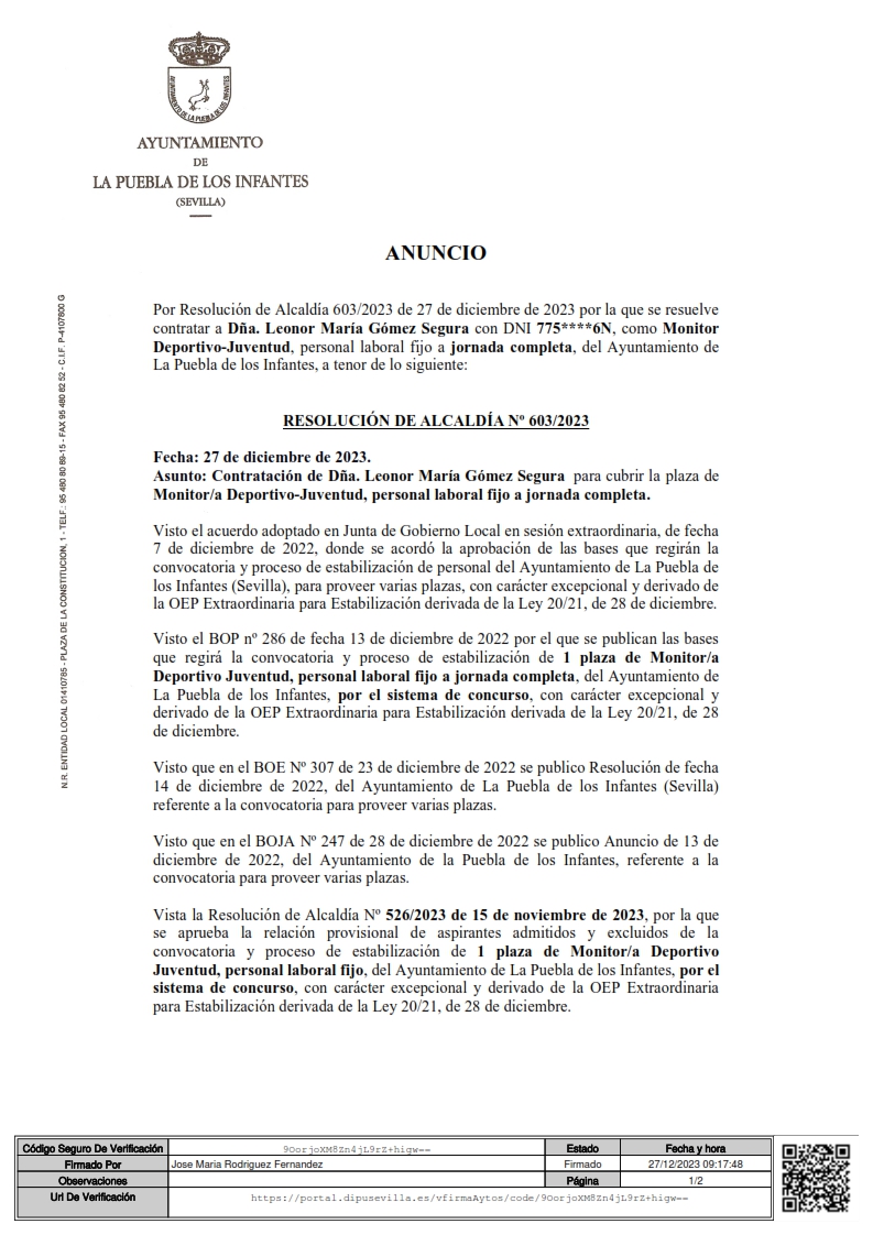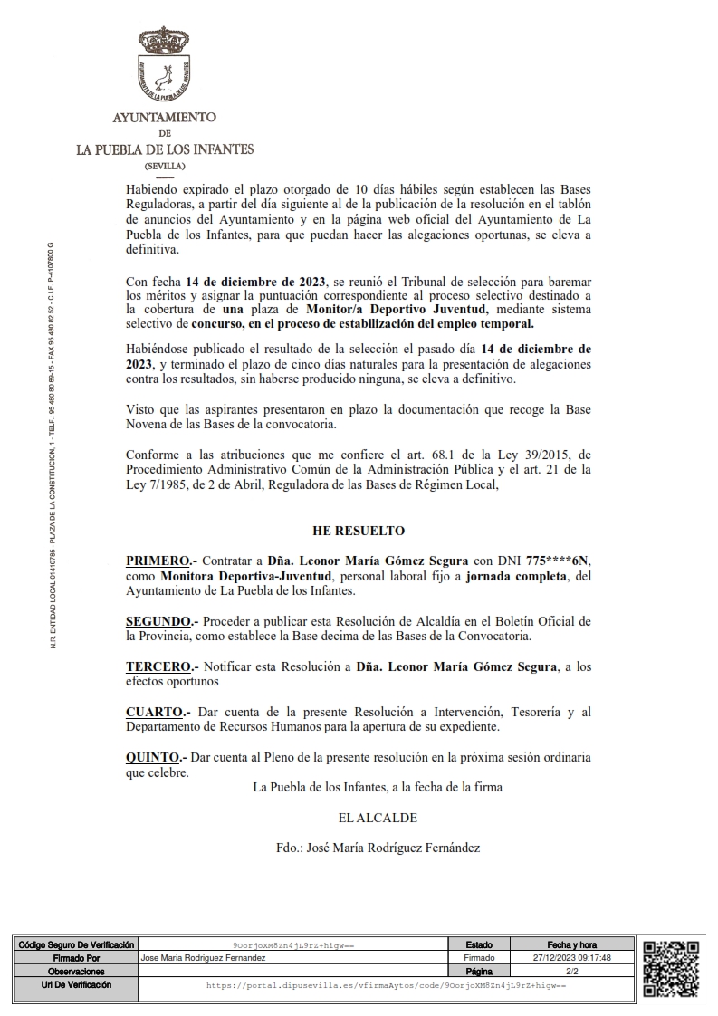 Anuncio del nombramiento de una plaza de Monitor Deportivo-Juventud