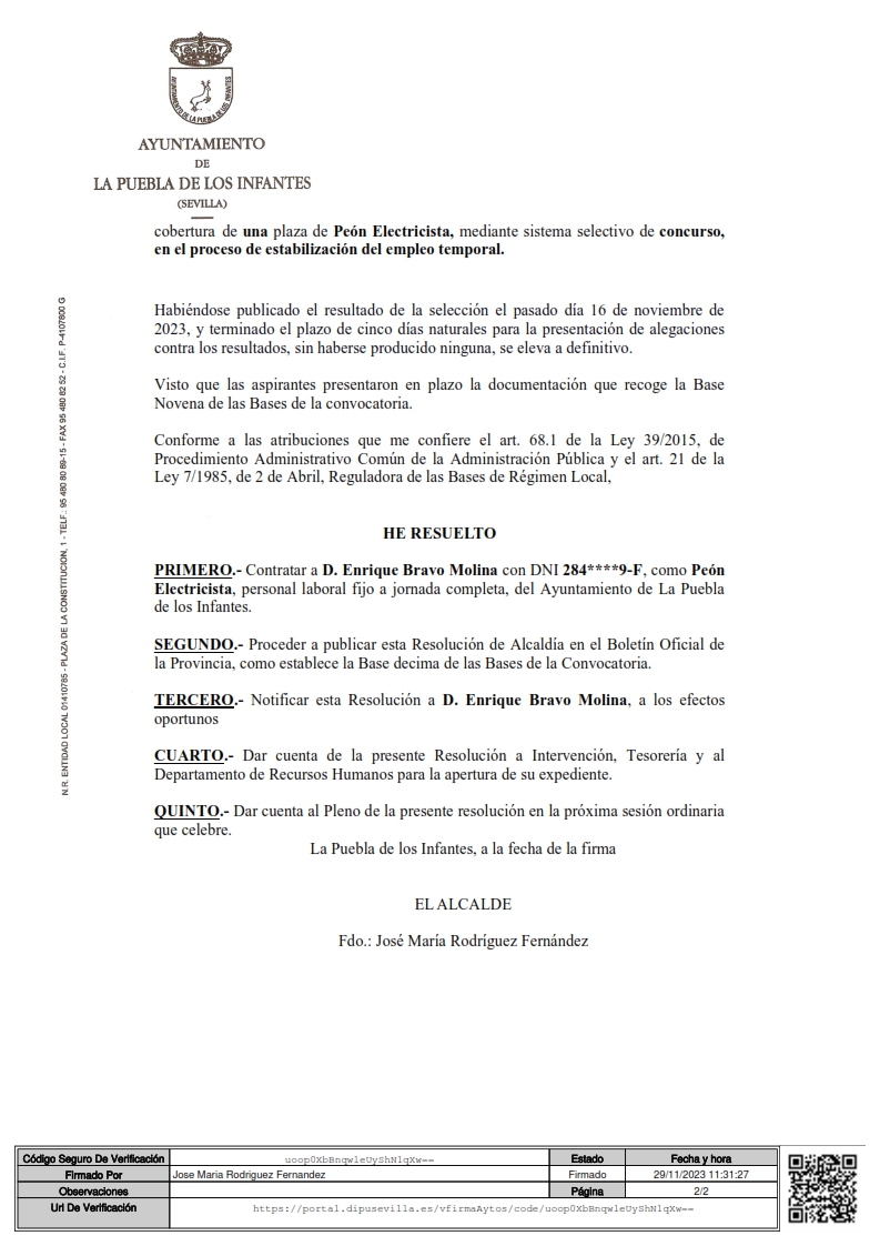 Anuncio del nombramiento de una plaza de Peón Electricista