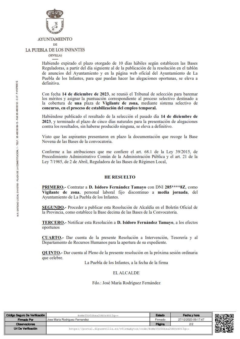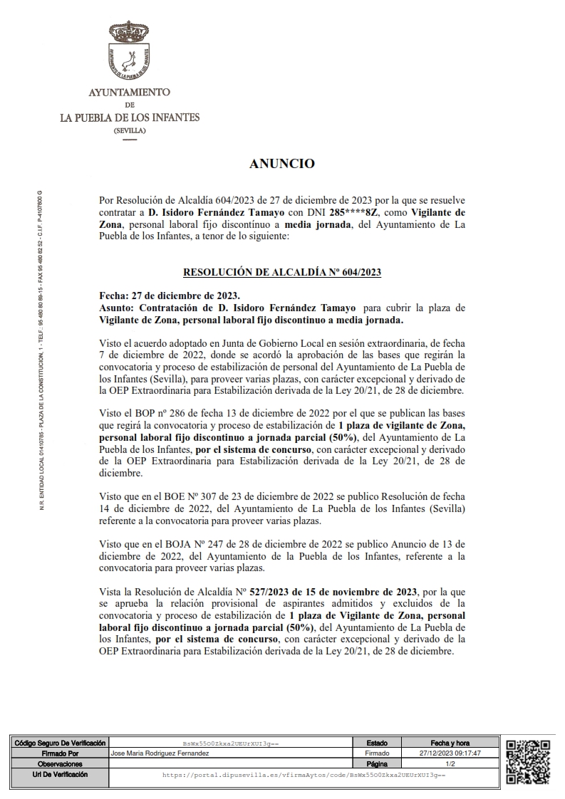 Anuncio del nombramiento de una plaza de Vigilante de Zona