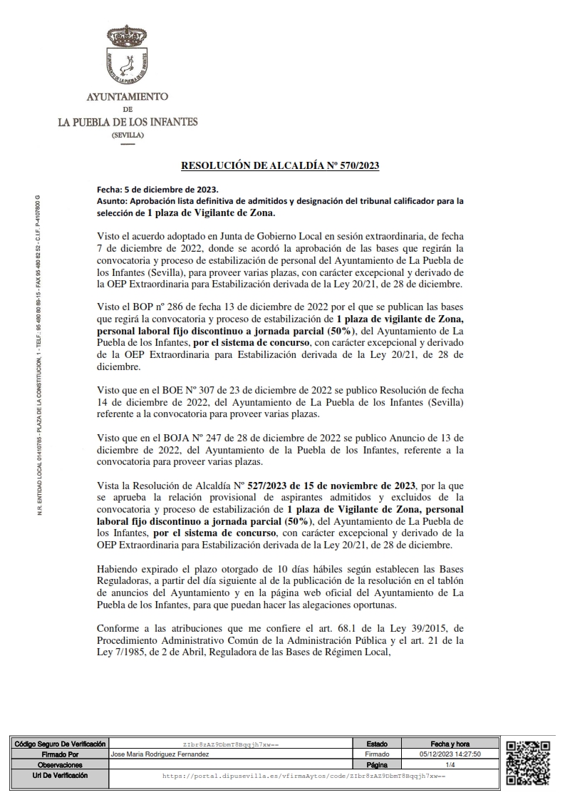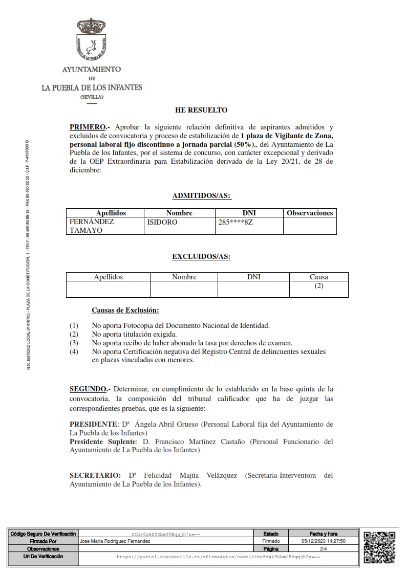 Relación definitiva de aspirantes admitidos y excluidos de convocatoria y proceso de estabilización de 1 plaza de Vigilante de Zona