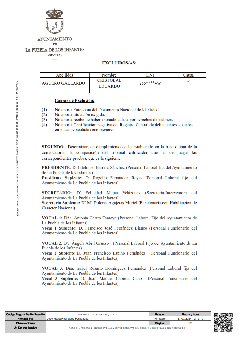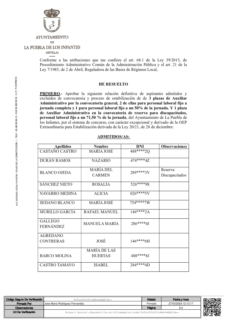 Relación definitiva de aspirantes admitidos y excluidos de convocatoria y proceso de estabilización de 4 plazas de Auxiliar Admnistrativo, 1 reservada para discapacitados