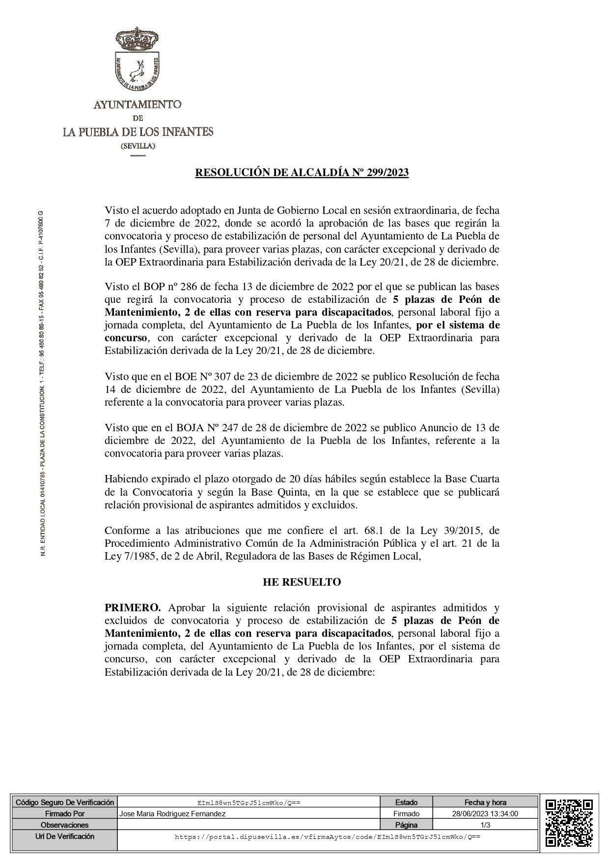 Resolución 299-2023 Lista provisional Admitidos Peón Mantenimiento F